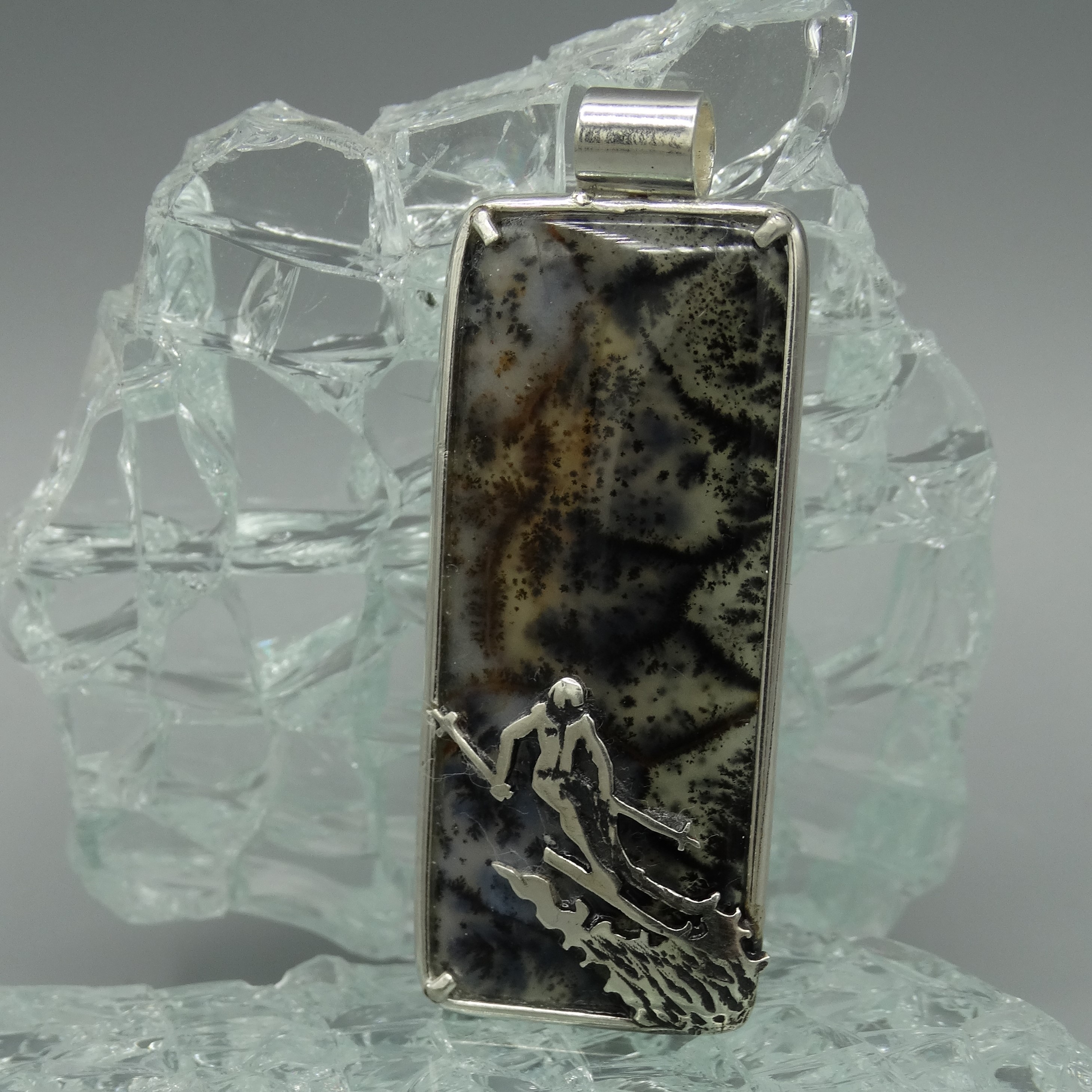 "Pieza única realizada en plata de ley y una espectacular ágata dendrita con diseño inspirado en el deporte del esquí. Un original colgante unisex de forma rectangular "